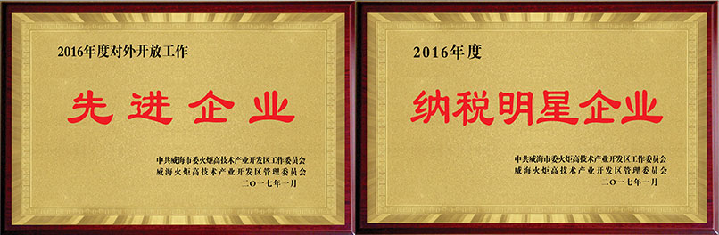 2016年公司经过全体努力取得了傲人的成绩,在威海高区的年度表彰会上:我们荣获“纳税明星企业”、“创新平台建设先进企业“、”科技创新先进企业“、”科学技术一等奖“、”对外贸易先进企业“等荣誉及称号。