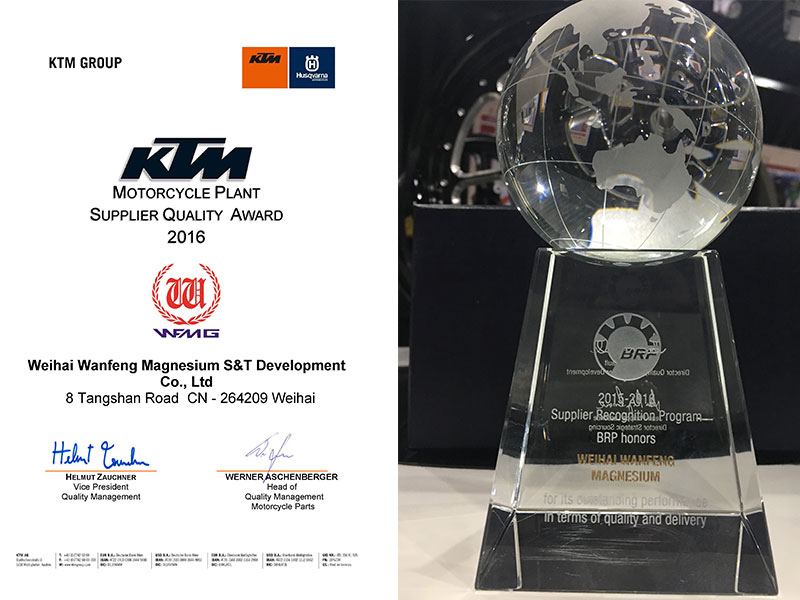 2016年,公司荣获BRP、KTM客户两项供应商质量奖。