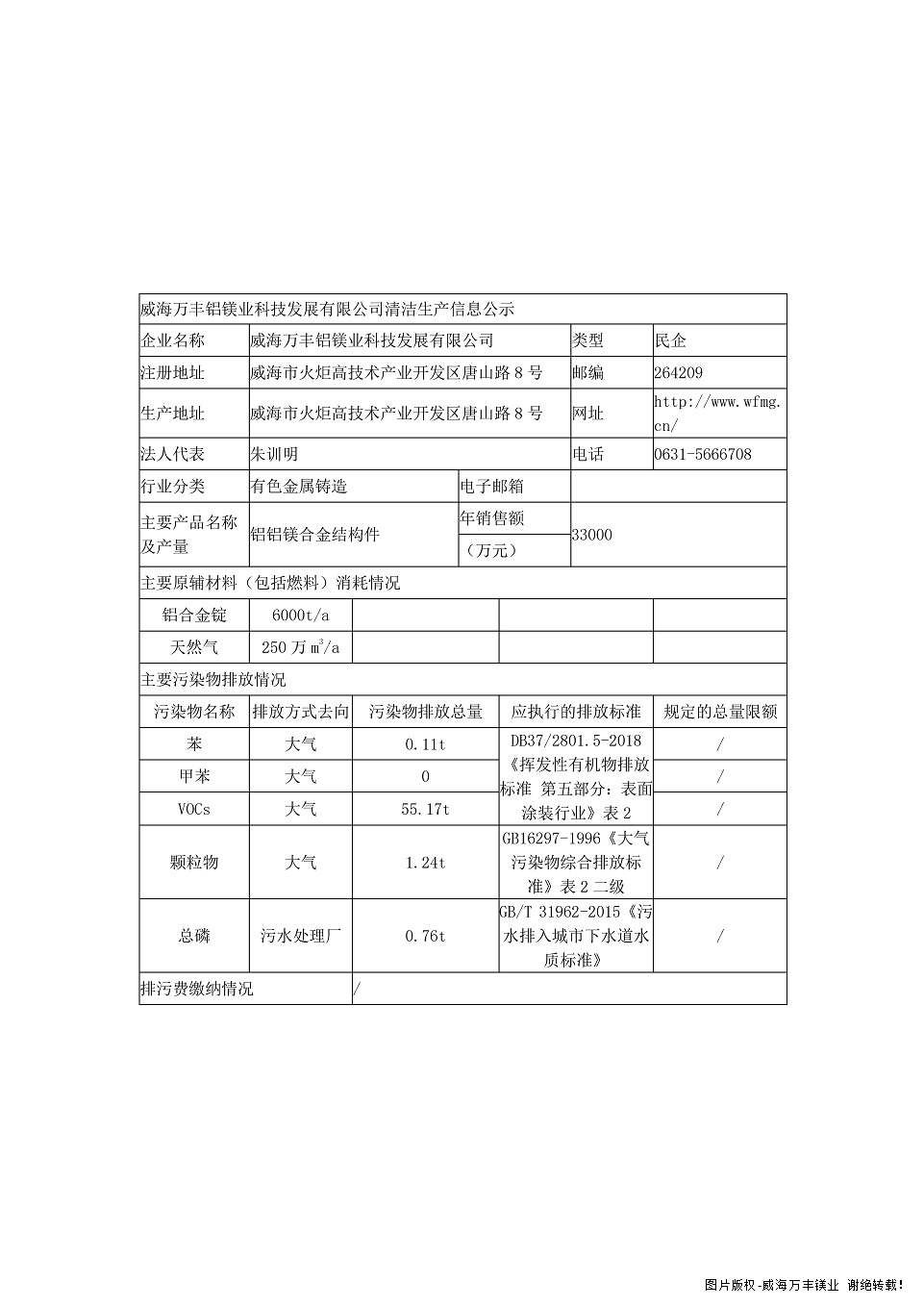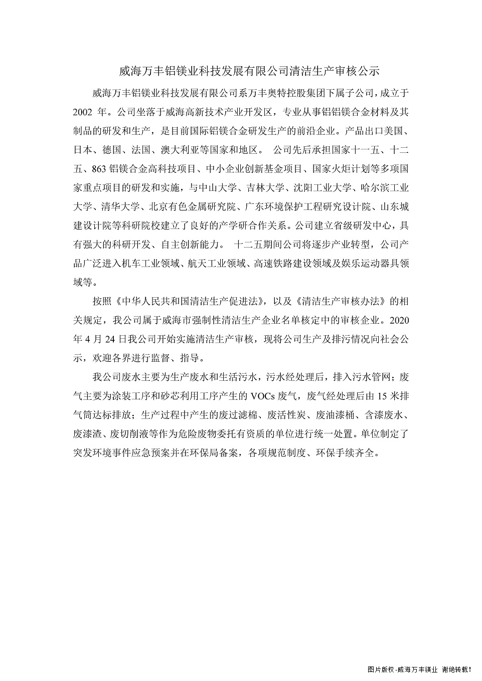威海万丰铝镁业科技发展有限公司清洁生产审核公示