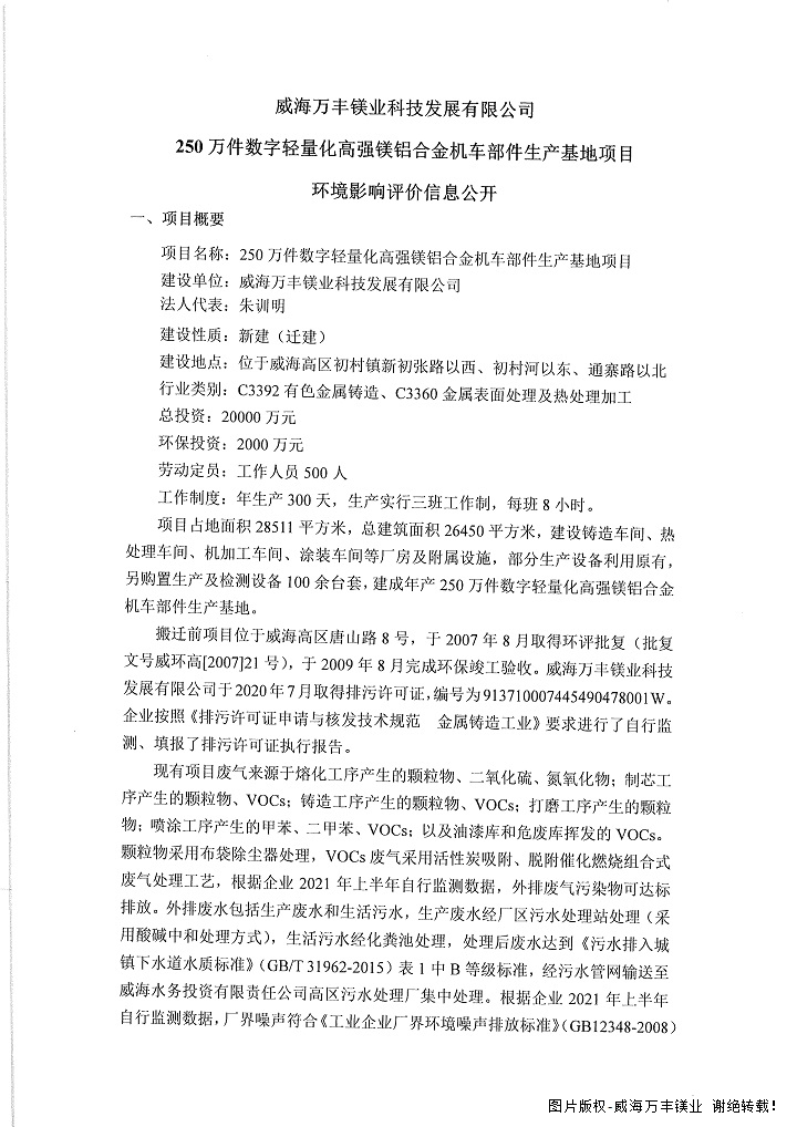 250万件数字轻量化高强镁铝合金机车部件生产基地项目环境评价信息公开